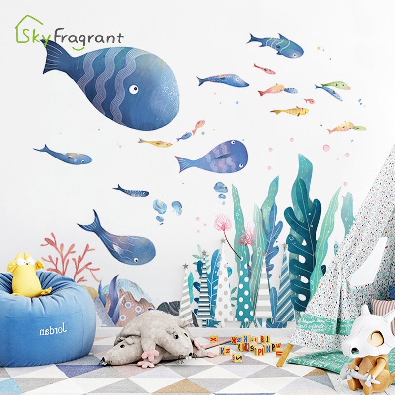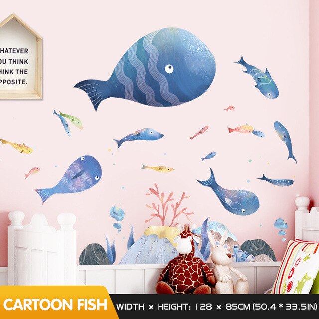 Cartoon underwater world wall sticker ocean cute fish kids room decoration stickers bathroom self-adhesive home bedroom decor