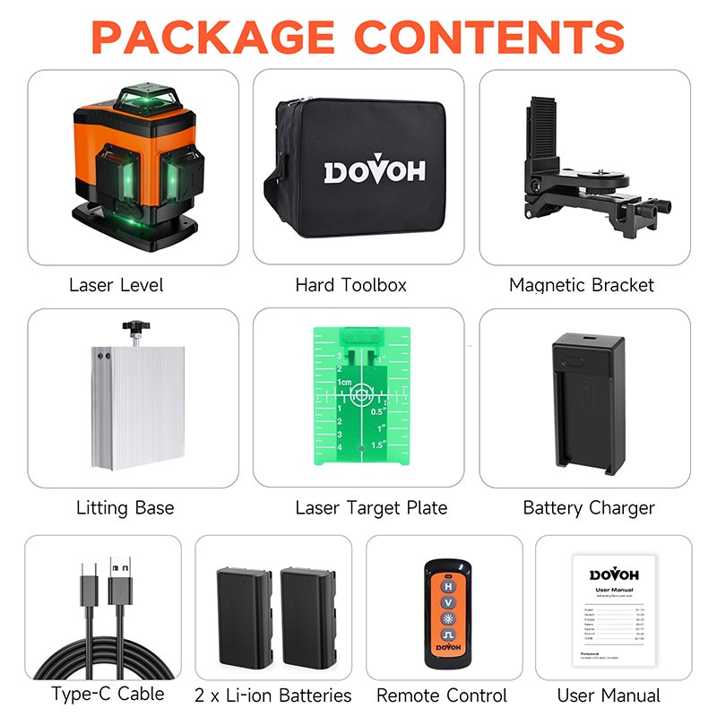 【5 Years Accuracy Warranty】DOVOH is committed to providing high-accuracy laser levels to our customers. For laser levels with unqualified accuracy caused by regular use in 5 years, DOVOH will repair or replace with a new item without charge. And DOVOH provides 2 years warranty for any quality issues caused by regular use.