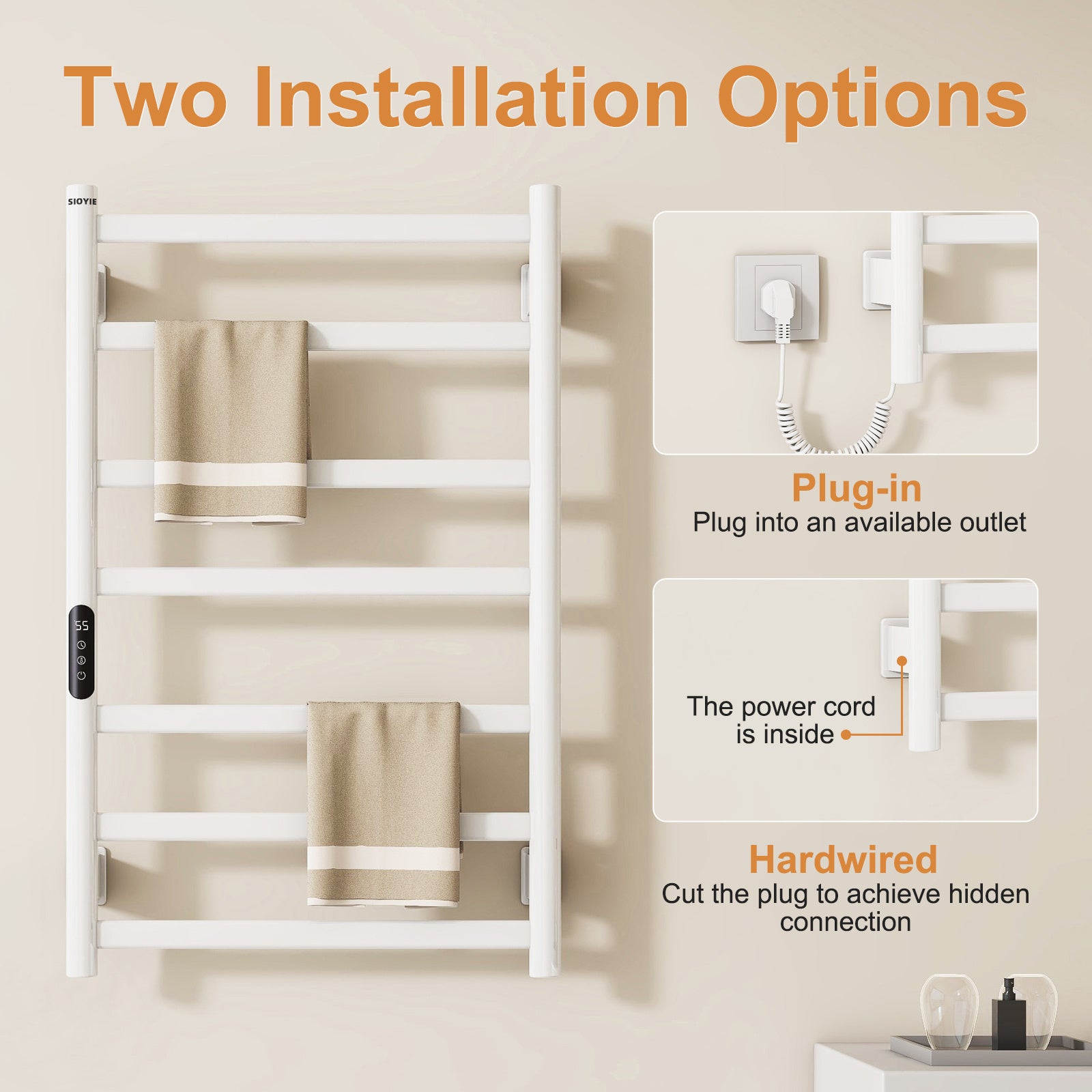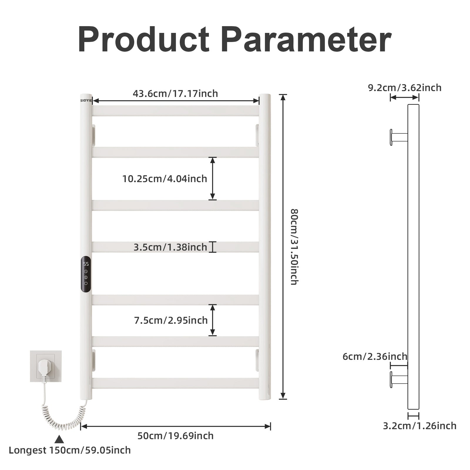 SIOYIE Towel Warmer Bathroom Wall Mounted 6 Bars Electric Towel Drying, 150 W 500 800 MM Heated Towel Rack With Intelligent Touch Screen Timer And Temperature Control White Left